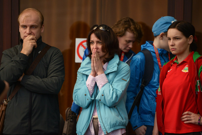 А у автобусов, где собрались пловцы перед выездом в бассейн, тренер «воспитывает» подопечную: «Нажимай сильнее руками, чувствуй сопротивление воды, и всё у тебя получится».