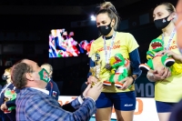 Первыми на паркет вышли претендентки на бронзовые награды. Первую партию здесь неожиданно легко, но абсолютно по делу выиграли девушки из Восточной Сибири - 25:9. Во втором сете калининградки сумели навязать борьбу и даже в какой-то момент выйти вперёд, но сибирячки, прибавив в концовке, своего не упустили - 25:19. 2:0 - «бронза» уезжает в Иркутск, а хозяйки турнира впервые в его истории не попадают в призы.